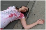 On the second day of Halloween week, this themed blog gave to thee: Horror Film Cliche. In every horror film there is a 20 minute chase sequence where one poor pretty girl gets the world thrown at her – hit by a car, stabbed, shot, hit, you name it – and just as she is about to escape she is killed by the villian, this is what I’ve chosen to dress as today. Please note: the tyre marks on my shirt were made from me painting a type and rolling it across my shirt for true effect.