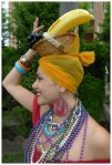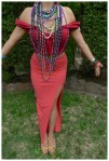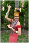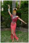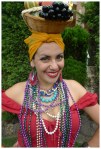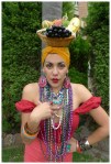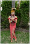 February 9 is Carmen Miranda’s birthday. Carmen Miranda was a Portuguese-born Brazilian samba singer, dancer, Broadway actress, and film star who was popular in the 1940’s and 1950’s. She is best known in popular culture from her signature fruit hat worn in the 1943 movie The Gang’s All Here. Therefore pulling off this outfit hinged ENTIRELY on the creation of said fruit hat….and let me tell you it wasn’t easy. First off I had to go to FIVE different dollar stores before I could even find any fake fruit for which to get the materials for the hat. Then on today of a temperature of 30 degrees Celsius I had to sit and anxiously arrange, tape and somehow affix said fruit to my head. In the end I had to lean it against a teased bun that I elastic-ed it too and then secured with my head scarf. If I was ever unsure of my poise, I am no longer. Hope it was worth the effort!
