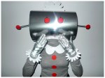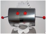 Silver robot head: Homemade from silver cardboard, red and white paper and straws