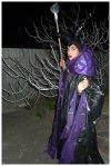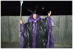 Black cape: Black garbage bags with purple plastic table coverings taped on the edges, then newspaper covered in purple plastic table covering for the puffy neckline